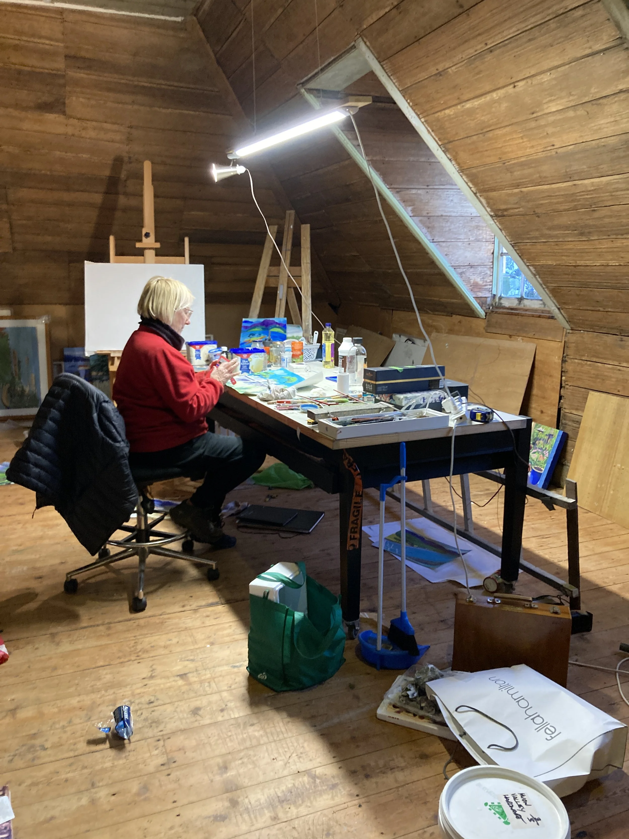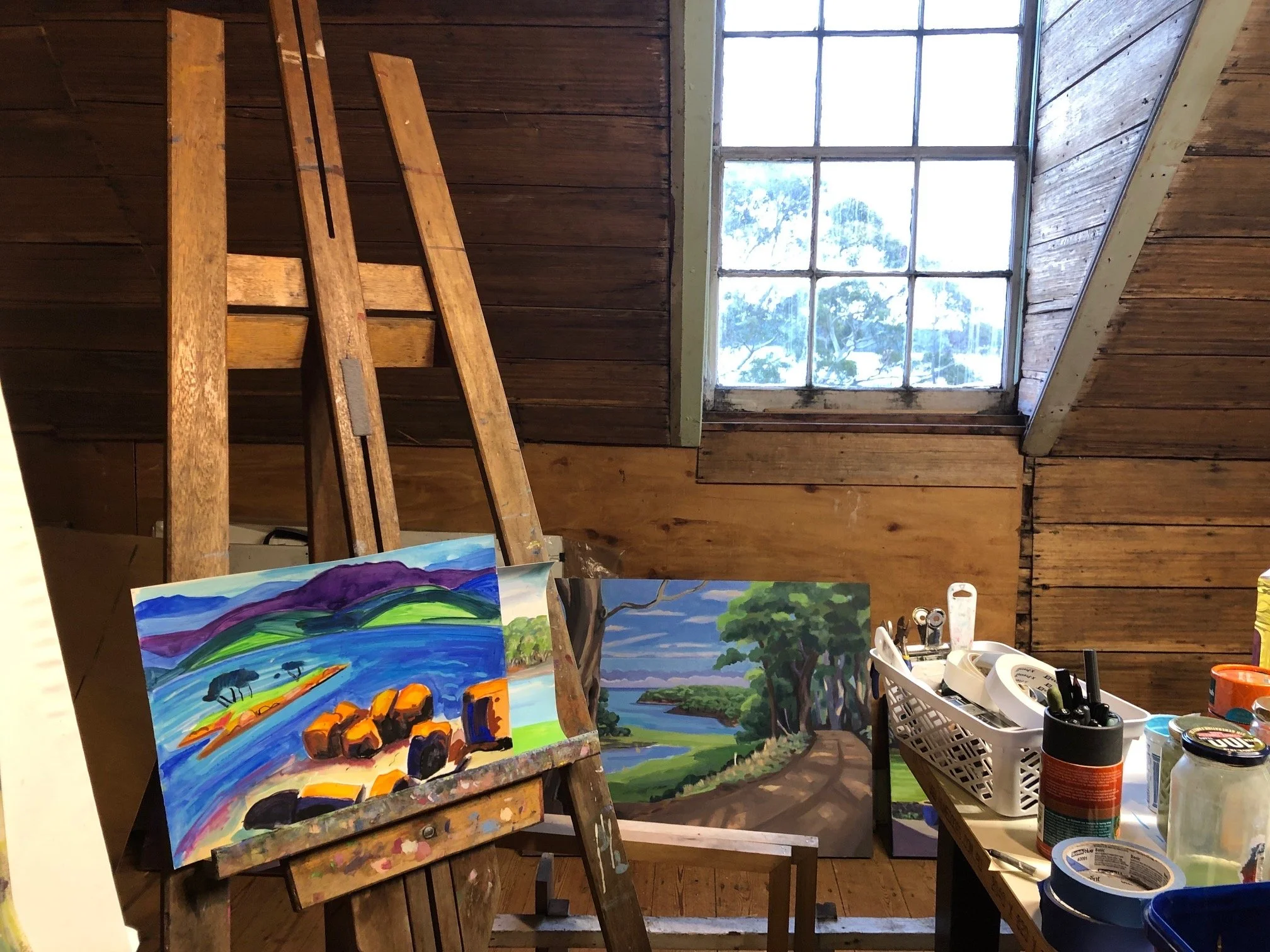 Her studio is located in an old store room in the heritage listed Jetty House. It offers her beautiful views of the bay from the dormer windows where she works.